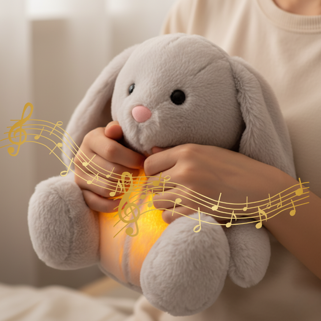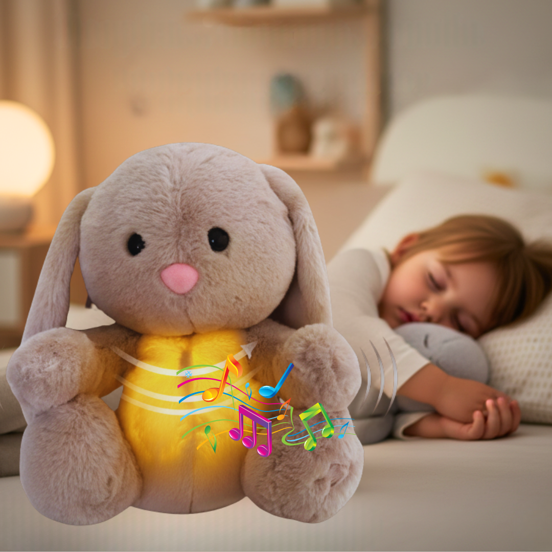 El conejo de peluche con respiración simula un suave movimiento rítmico, creando una sensación real de compañía y tranquilidad desde el primer abrazo.