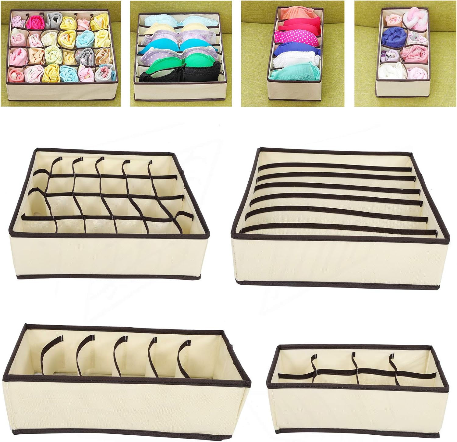 Incluye divisiones bien definidas para brasieres, panties, boxers, medias u otros accesorios, manteniendo todo en su lugar.