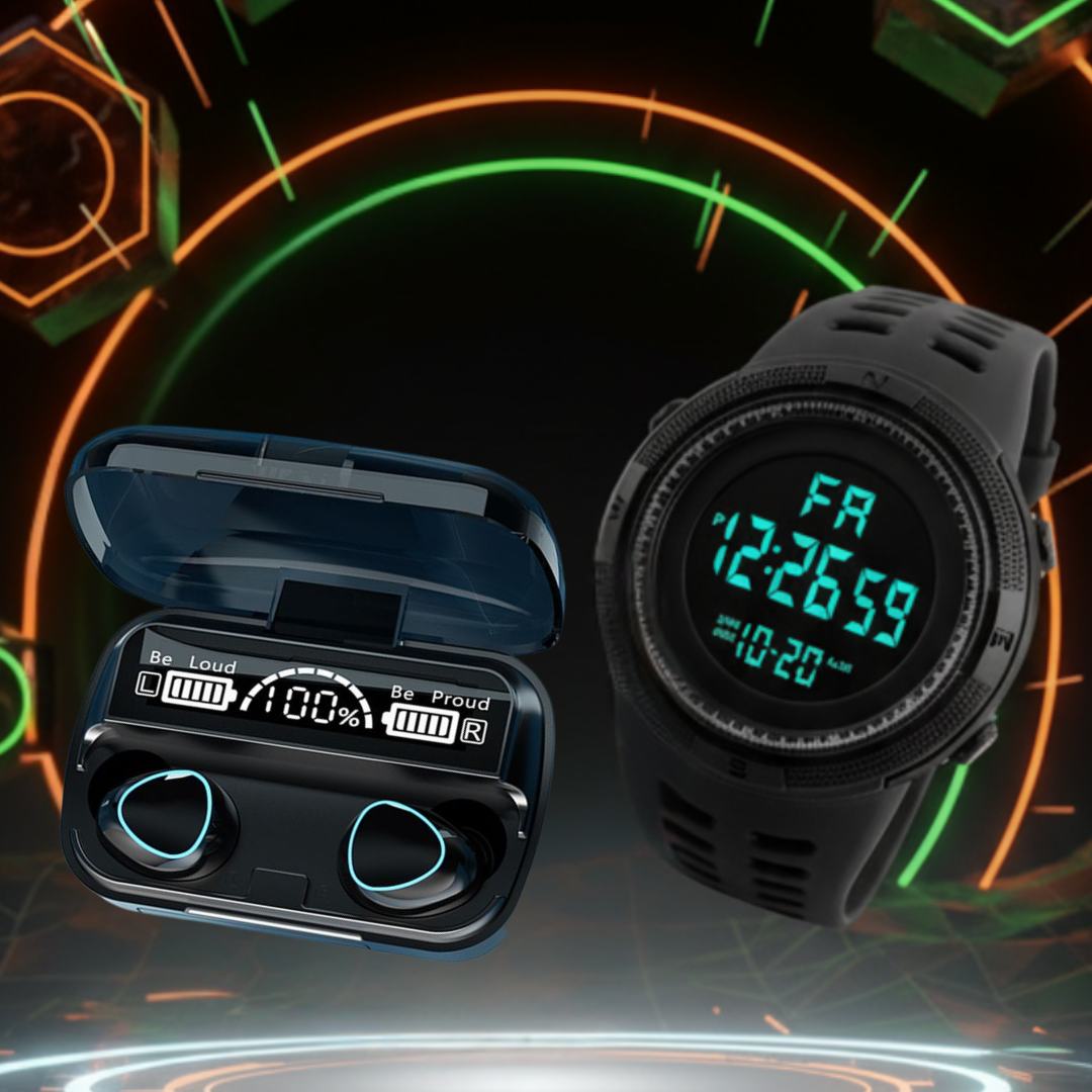 El combo que transforma tu estilo: un reloj LED verde futurista ⌚✨ y audífonos con sonido envolvente 🎧🔥. Tecnología, actitud y comodidad en un solo pack.